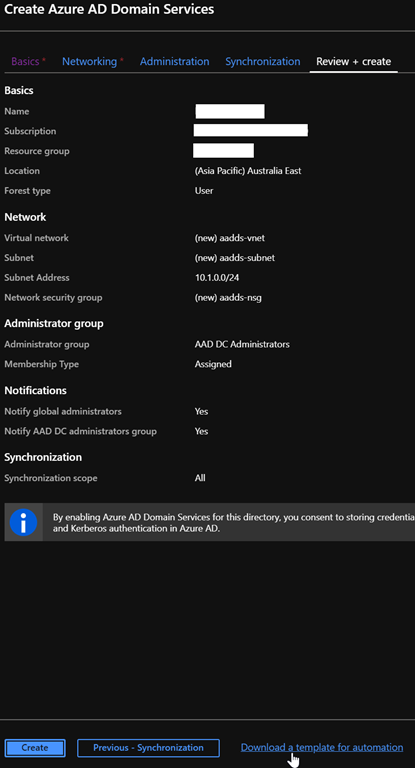In addition, of this you can now use ARM template to deploy Azure AD DS – you can download a sample of Azure AD DS ARM template by using the Azure AD Domain Services creation wizard and then use the Download a template for automation option at the end of the wizard.