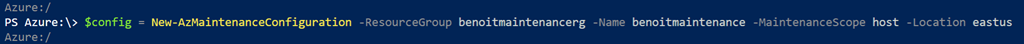 $config = New-AzMaintenanceConfiguration -ResourceGroup <the resource group created above> -Name <your custom maintenance configuration name> -MaintenanceScope host -Location <location – should be the same as your resource group>