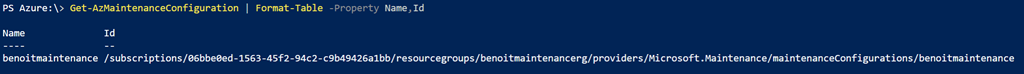 Get-AzMaintenanceConfiguration | Format-Table -Property Name,Id