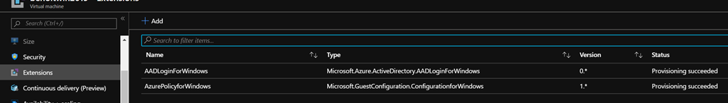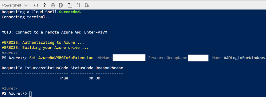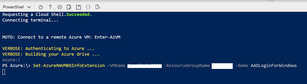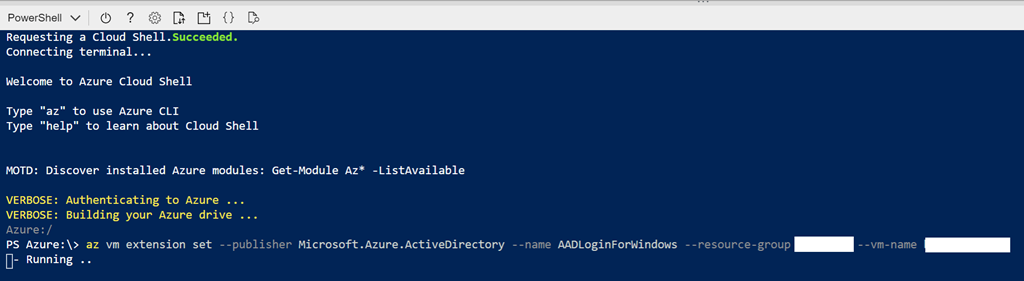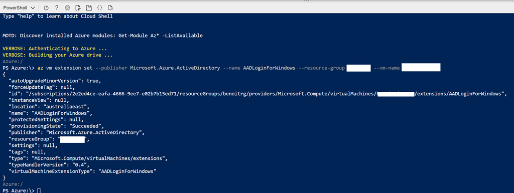 Once the virtual machine has been created, you will still need an additional action using PowerShell or Azure Cli – you can use the Cloud Shell to do it – to install the Azure AD extension
