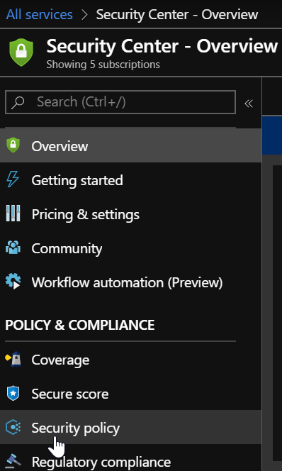 To update your Azure Security policy to include the new Azure CIS 1.1.0 with the dynamic update, logon to your Azure portal (https://portal.azure.com/) and go to the Azure Security Center configuration blade