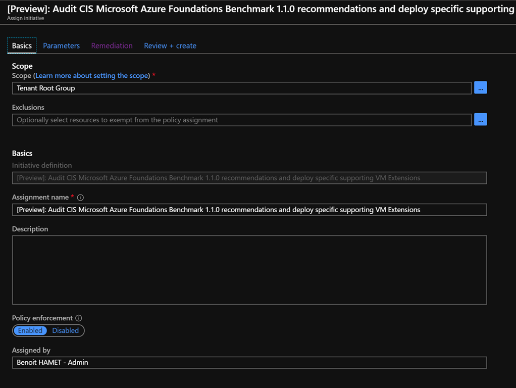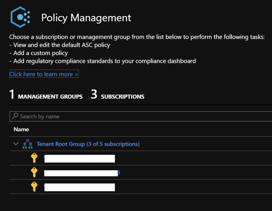 Then go to the Security Policy blade and select the management group (recommended) or the subscription you want to update with the new Azure CIS policy