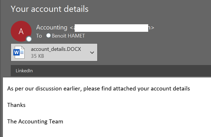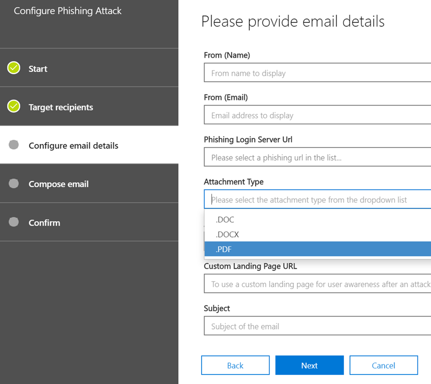 From there launch the new scenario called Spear Phishing (Attachment) Account Breach and follow the wizard to set the context of the attack simulation which mainly consists of setting up the targeted user(s), the (so called) phishing email details (from, attachment type [doc, docx or pdf)…)