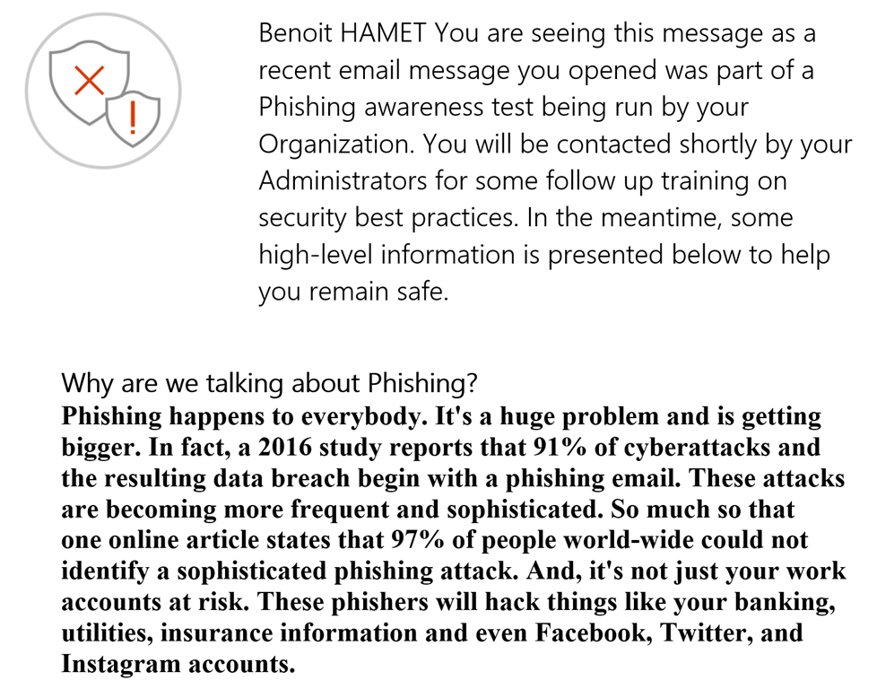 Result of this attack simulation will then help you to reinforce communication and training to your end-users to report any suspicious email using the Report message add-in which is available on all Outlook client (desktop, OWA and even mobile)