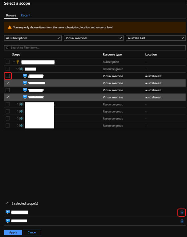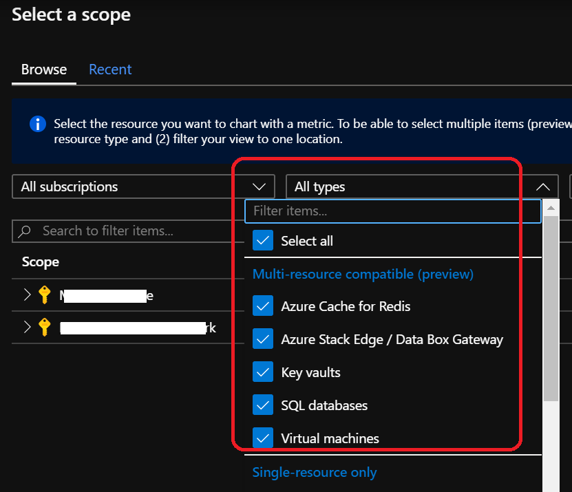 Then you need to define the scope which then will let you filter to select one of the multi-resource supported Azure resource and to filter to view only one location; currently limited to: