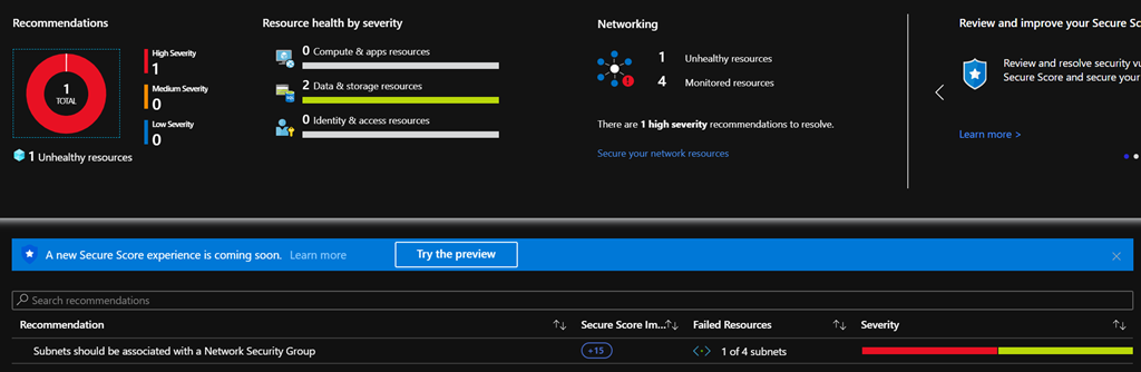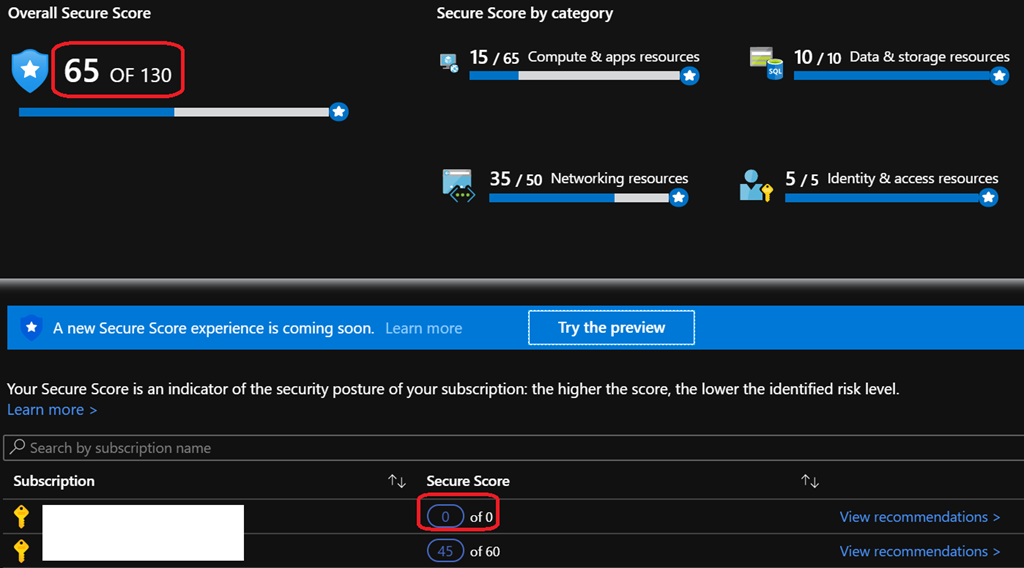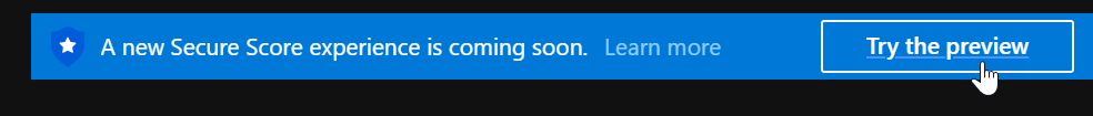 From there you will see a blue banner ‘A new Secure Score experience is coming soon’ with the Try the preview button