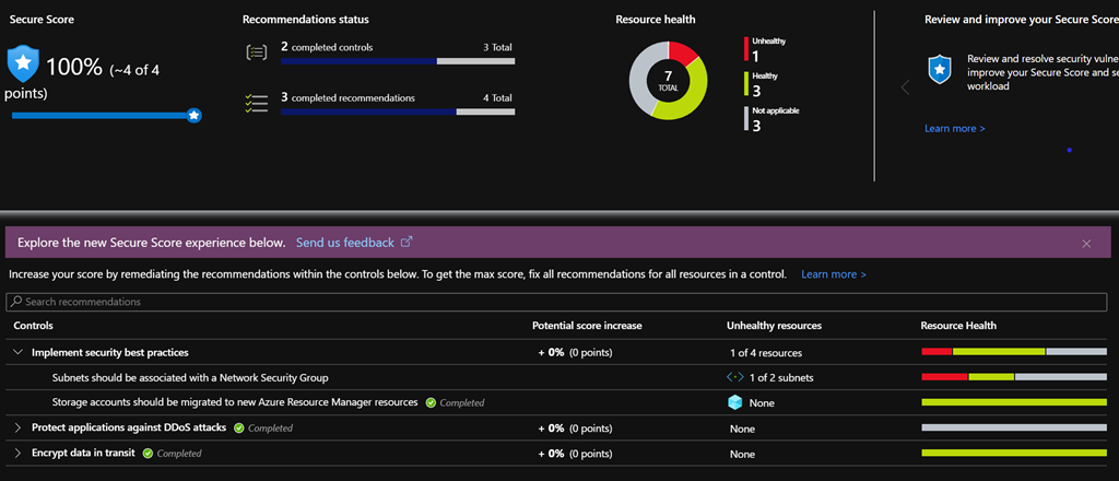 Then when you go to the Subscription level to view the recommendations, you have clearer view of your security posture with the use of the Pie chart and you can view all recommendations grouped by controls
