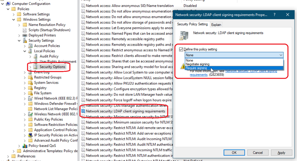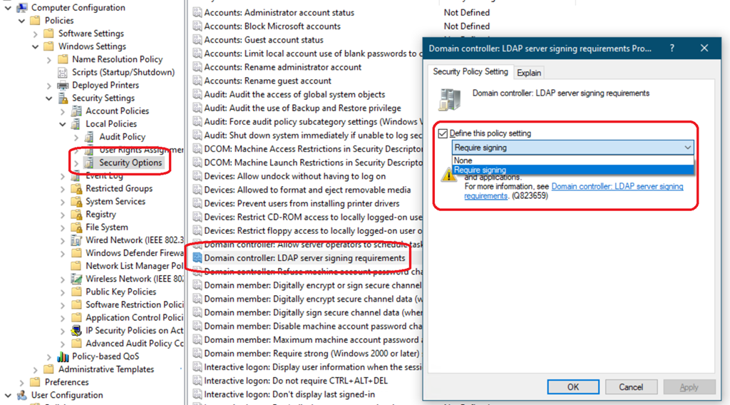 Settings\Local Policies\Security OptionsSet the Domain controller: LDAP server signing requirements setting to Require Signing