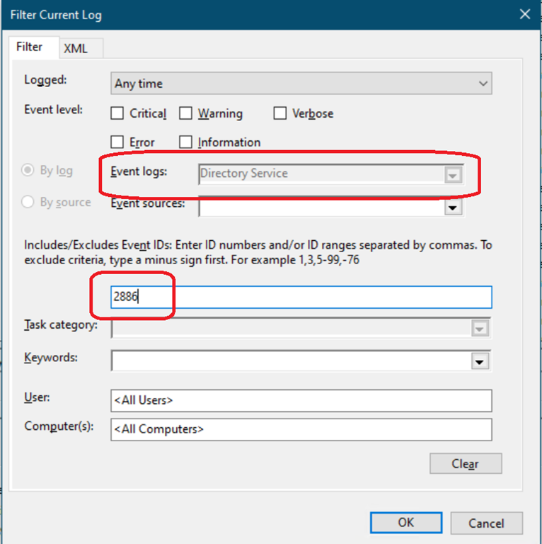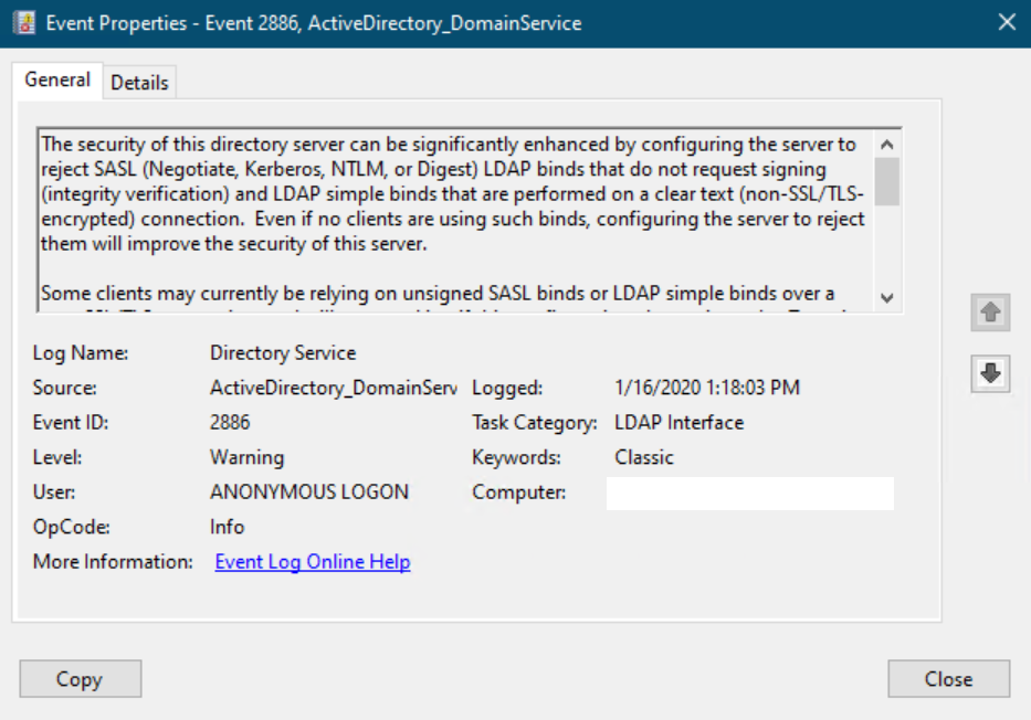 - To check if there is any unsecured LDAP request and from where this is coming from, check for the Event ID 2886 in your Directory Service event log in your Domain Controllers