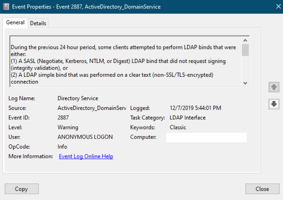 - If you have any Event ID 2887, then you need to enable LDAP Interface Events using either PowerShell or registry to track down which endpoint(s) is/are generating unsecured LDAP request as documented in the Microsoft KB 314980 https://support.microsoft.com/kb/314980/