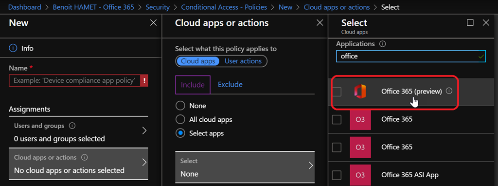Well, good news as the Azure AD team is trying to simplify this process by providing your an overall Office 365 app for setting up conditional access to Office 365 suite.