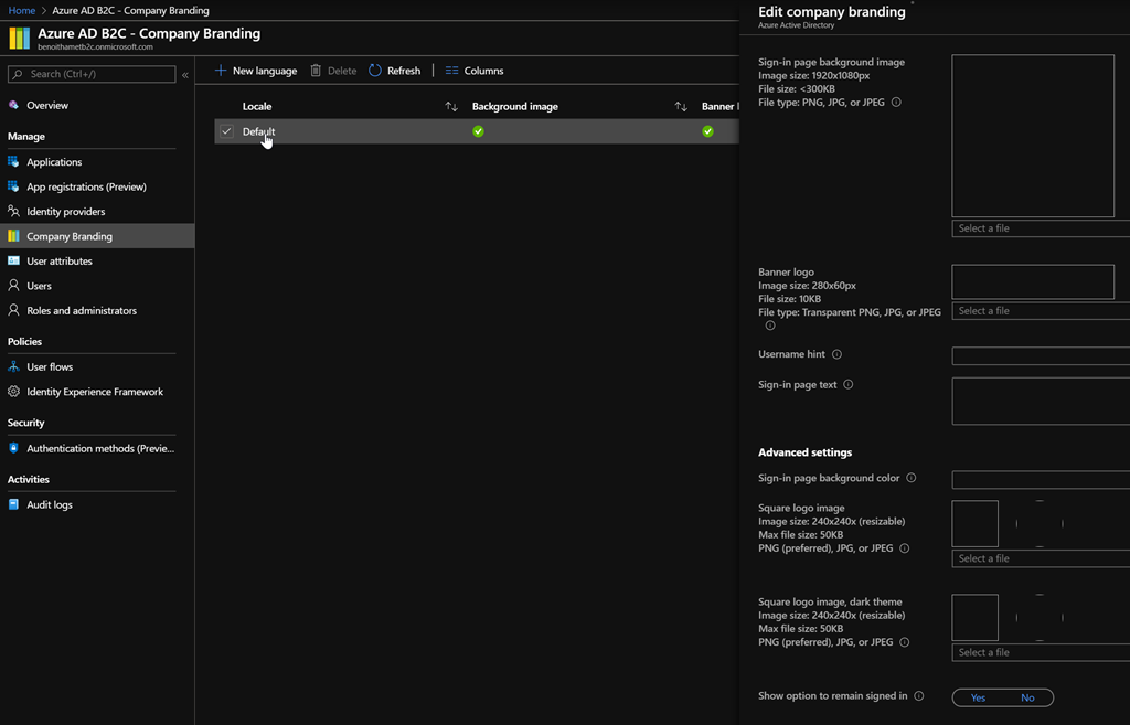Now, you can customize the layout by accessing your Azure AD B2C tenant and then go to Company Branding blade to upload your custom logo and/or background.