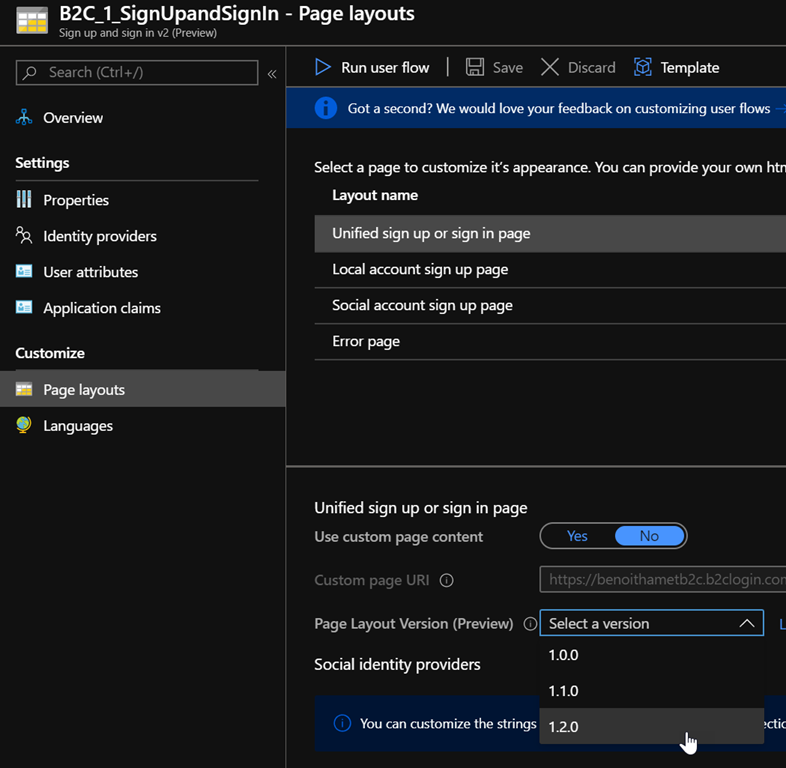 Then you need to enable this branding to your user flows by accessing the User flows blade and then edit the flow you want to customize using the Page Layouts blade and edit the Page Layout Version to the version 1.2.0 (or higher when new version becomes available)