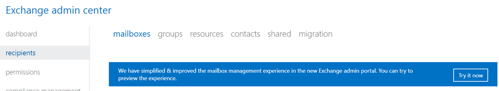 Interestingly this new experience is being advertised only from the mailboxes management section of the current ECP, not from the other available sections.