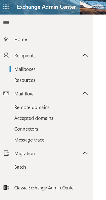 As you can notice, you can also manage from this new experience migration batches, mail flow (domains management, connectors…) in addition of user and resource mailboxes (no shared mailboxes for now).