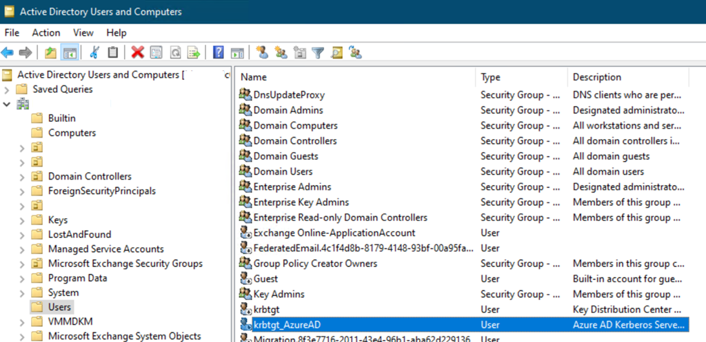- From your Azure AD Connect server, create a Kerberos object using the below PowerShell commands; this will create a disabled user account called krbtgt_AzureAD located in the Users default OU