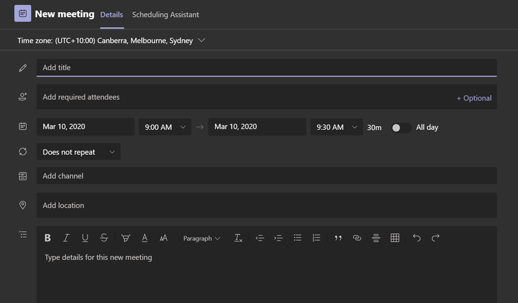 Then when you access your Calendar in your Teams client and hit the New Meeting you will get this new enhanced experience