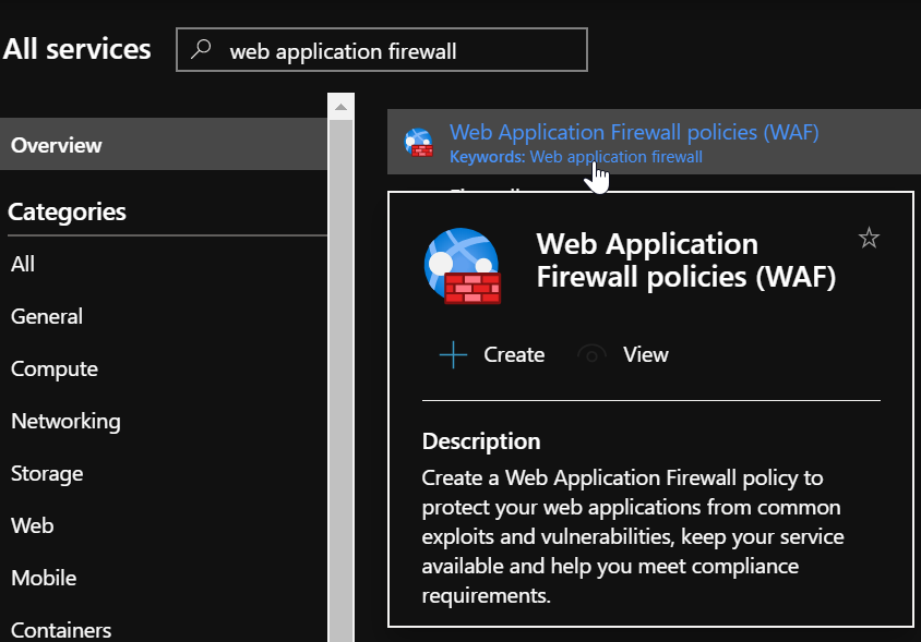 Using the portal, search for web application firewall and then create or update your WAF policy