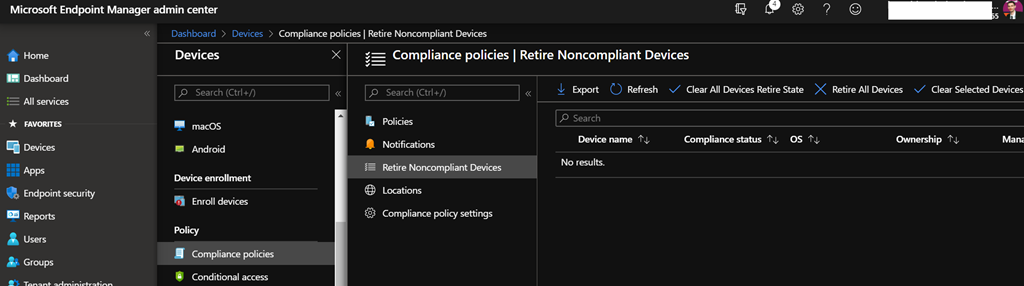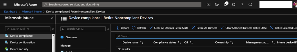 This can be accessed from either the Azure portal (https://portal.azure.com/) through the Intune\Device Compliance\Retire Noncompliant Devices blade or the Endpoint Configuration Manager portal (https://devicemanagement.microsoft.com/) through the Devices\Compliance Policies\Retire Noncompliant Devices blade