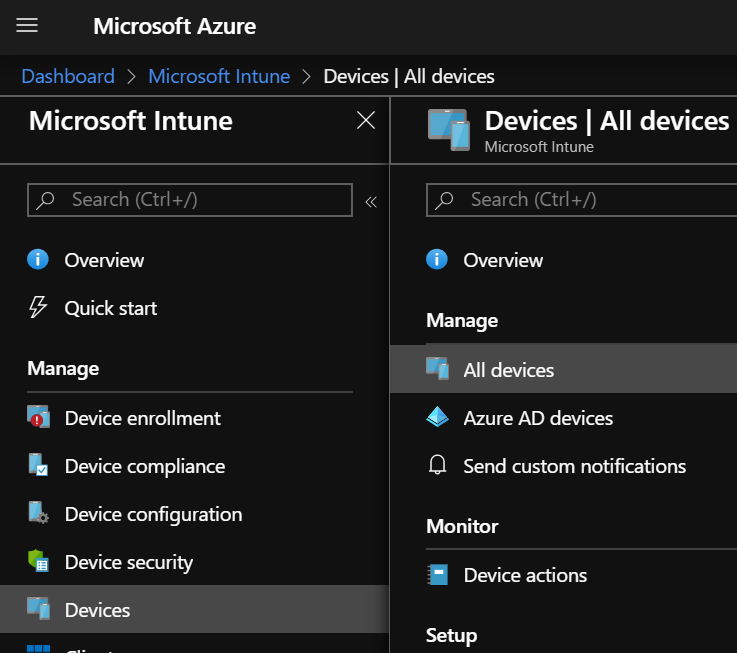 To do such thing, logon to your Azure portal (https://portal.azure.com/) and reach the Intune\Devices\All Devices blade, or your Endpoint Configuration Manager portal (https://devicemanagement.microsoft.com/ or https://endpoint.microsoft.com/) and reach the Devices\All devices blade