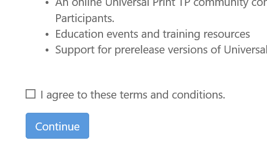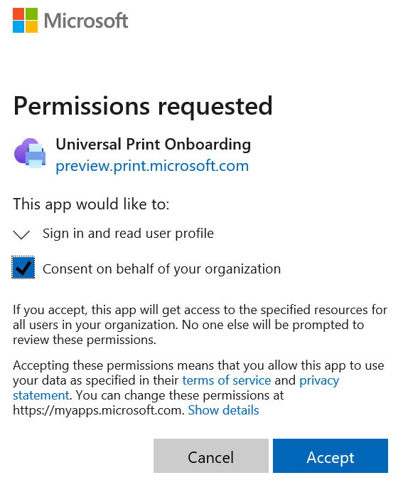 Connect to https://aka.ms/uppreview to grant permission to the Universal Print Onboarding Azure App the required permissions