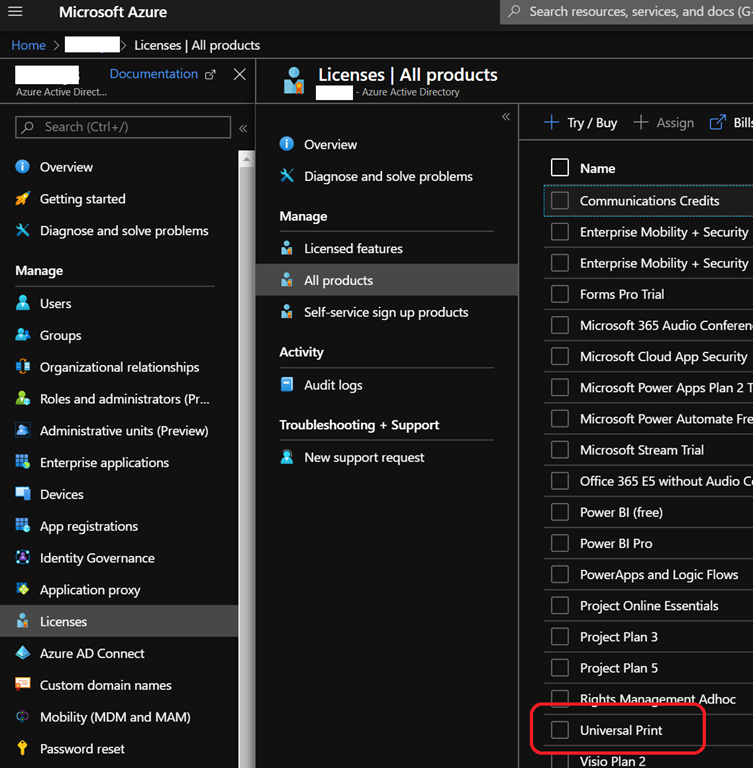 You can confirm you got the licenses by accessing your Azure AD portal (https://aad.portal.azure.com/) or Azure portal (https://portal.azure.com/) by accessing the Azure Active Directory\Licenses\All products blade where you should see Universal Print