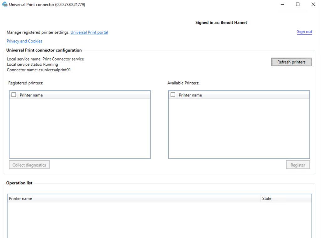 Once registered, you can check your connector by accessing the Universal Print administration blade on Azure (https://aka.ms/UPPortal)