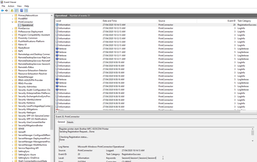 All activities with Universal Print (install, printer registration, printer management…) are logged under the Microsoft-Windows-PrintConnector/Operational Windows event log
