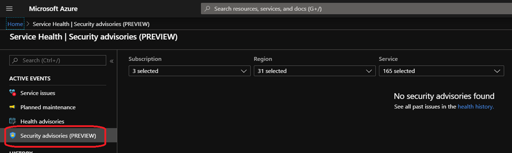 Security Advisories in Azure Service Health need to be differentiated from the Azure Security Center as it does not cover the same level of security.