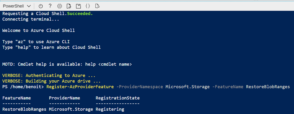Register-AzProviderFeature -ProviderNamespace Microsoft.Storage -FeatureName RestoreBlobRanges