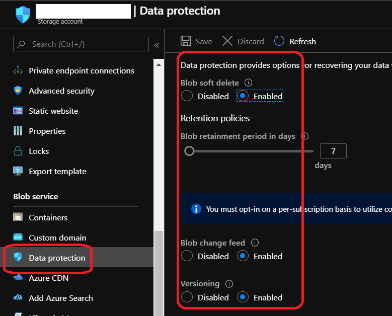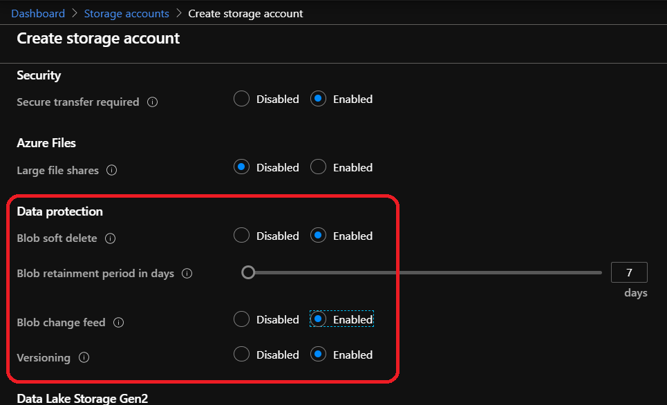 Then if you create a new storage account, ensure the below options available at the Advanced step under the Data Protection section are enabled: