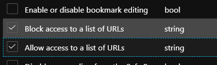 If you use the Managed devices policy type, the options to manage allowed/blocked URL’s are available in the Settings blade by adding the following configuration keys: