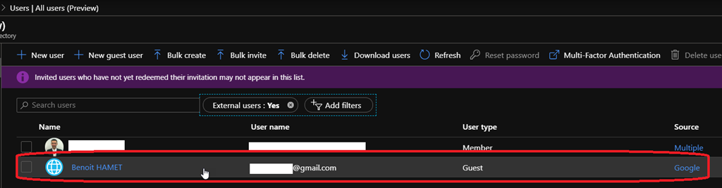 Once the process is completed by the external end-user, you will see you are Azure AD a new account automatically created for this user