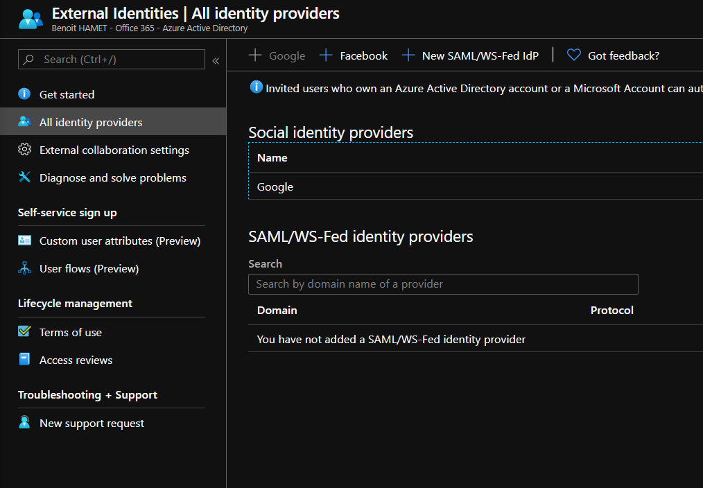 After allowing the use of one-time password authentication and guest access for Google account, you can now extend guest access to any identity provider (Microsoft and Google of course as already supported, but also Facebook or any SAML/WS-Fed identity providers). This is already well known for customer using Azure B2C (Business to Consumer).