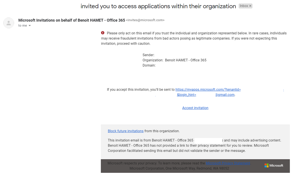 Below some screenshot of the process after inviting the external user; the external user looks his mailbox for the invitation email and then follow the simple and easy process to access the resources/application you have invited him