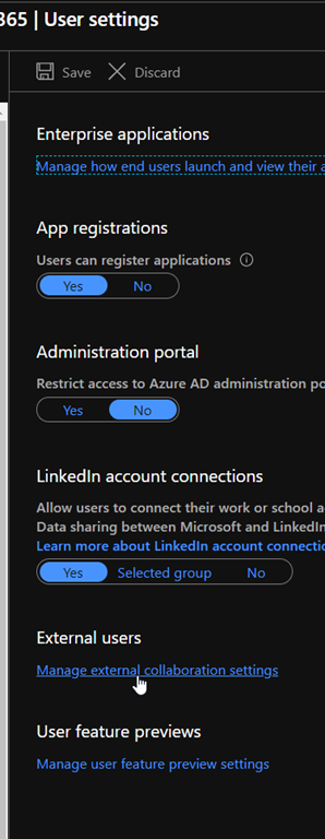 Then access the External Users option to enable the Enable guest self-service sign up via user flows