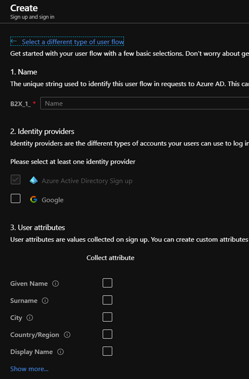 When creating a new user flow, you define the identity providers available for this flow (see above), which user attributes you need (if not available from the identity provider, end-user will be asked to fill it)