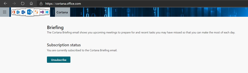 They can also use the Cortana web site (https://cortana.office.com/) to subscribe or unsubscribe to these emails