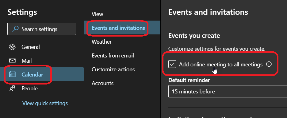 Then you go to the Calendar section and Events and invitations to turn on the Add online meeting to all meetings option