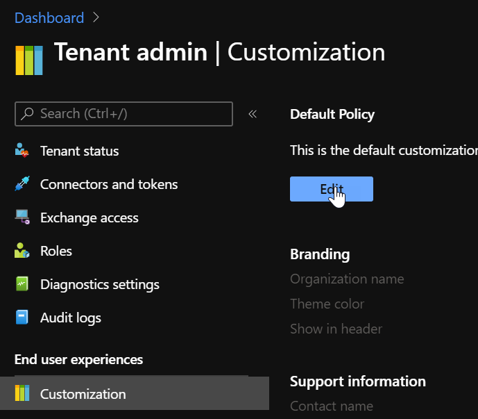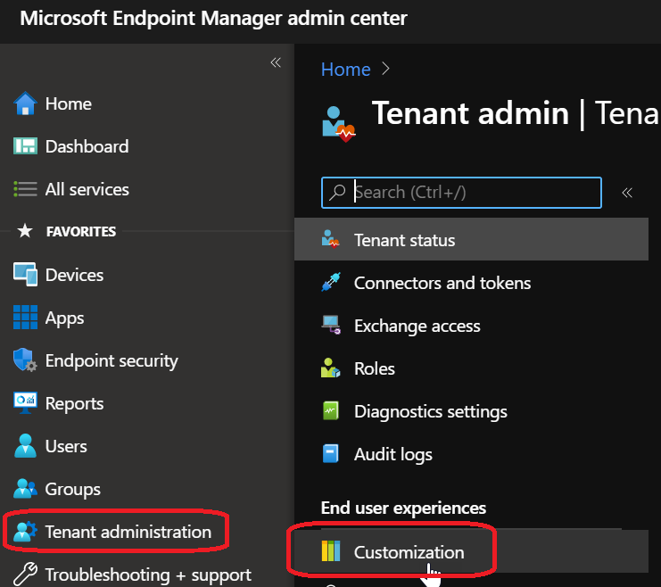 Logon to your Endpoint Configuration Manager portal (https://endpoint.microsoft.com/) and access the Tenant administration\Customization blade