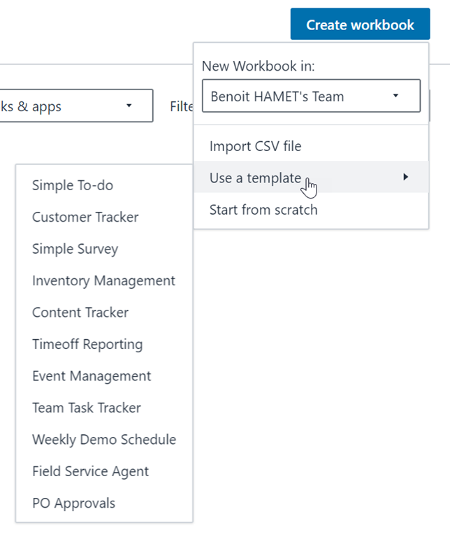 Then you can start building your first application with no code by creating a workbook and either start from scratch or use one of the predefined templates