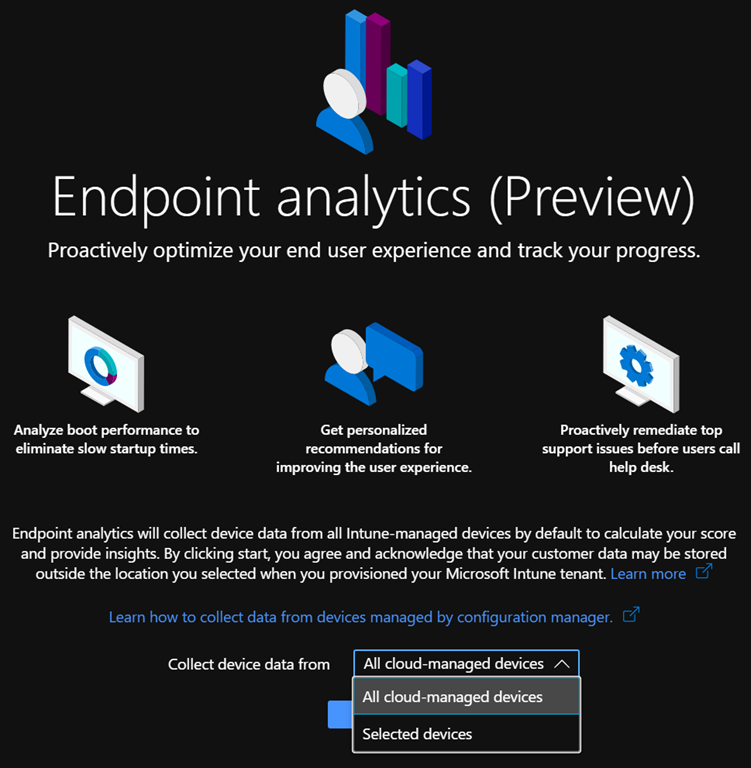 Once authenticated with an Intune/Endpoint Configuration administrator account you can turn on the Endpoint Analytics for either all cloud-managed devices or a selected subset