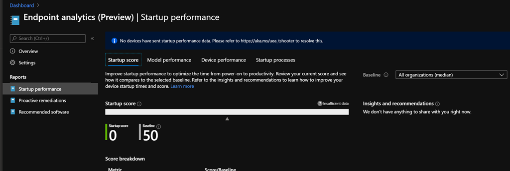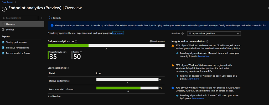 Then once you have enough data (and running time) you will be able to access the reports for Startup performance, Proactive remediation or Recommended software