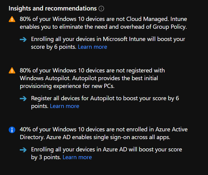 - Recommended software: Recommendations for providing the best user experience by optimizing OS and Microsoft software versions. This includes insights across management and deployment services such as Configuration Manager, Intune, and Autopilot, as well as Azure Active Directory and Windows 10.
