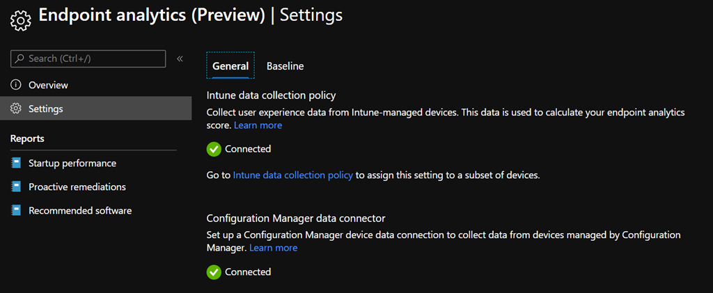 Once enabled you can then go to the Settings blade to manage the data source (you can onboard on your on-premises SCCM when using co-management) and define the baseline (after at least 10 devices have been reporting)