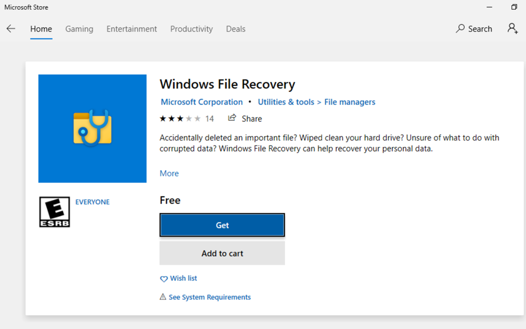 You can get it from the Microsoft Store either from the URL https://www.microsoft.com/store/r/9N26S50LN705 or by searching ‘Windows File Recovery’ in the search bar of the Microsoft Store application
