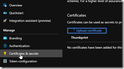 Upload the self-signed certificate you have generate earlier by accessing the Certificates & secrets blade