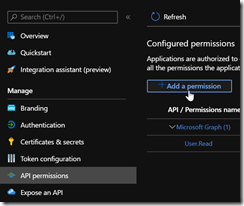 Then you need to assign permissions to the newly create application by accessing the API Permissions blade and then Add a permission