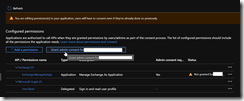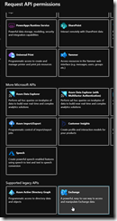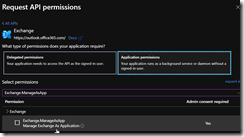 Then select Application permissions and the Exchange one under the Supported legacy APIs section to select Exchange.ManageAsApp after selecting Application Permissions