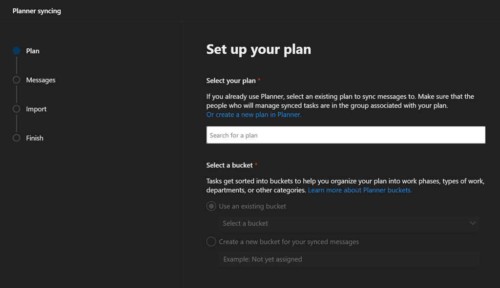 This will then launch the integration configuration to define the Planner plan (you can create a new one too which then will open the Planner site), the tasks buckets (which can help filter the messages based on their category), filter the messages you want to sync (by product and categories) and finally if you want to import the past messages (up to the last 28 days)